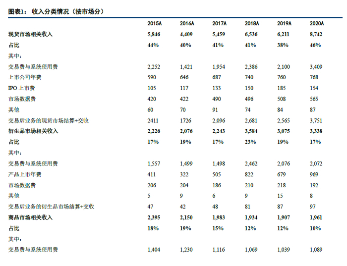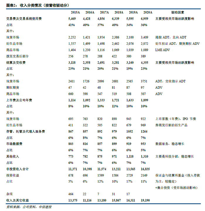现货市场业务收入为49.91亿港元,同比增长37%,占总收入比为26%,如果加上交易后业务中的现货市场结算费和交收费收入(37.5亿港元),则占比为46%。具体来看,跟ADT直接相关的费用增长明显,交易费及交易系统使用费为34.1亿港元,同比增长62%,现货市场结算费收入同比增长50%,较ADT增速高的原因主要是互联互通的额外贡献。此外,ADT的提升带动了现货市场EBITDA利润率的显著提升,从2019年的83%提升至88%。