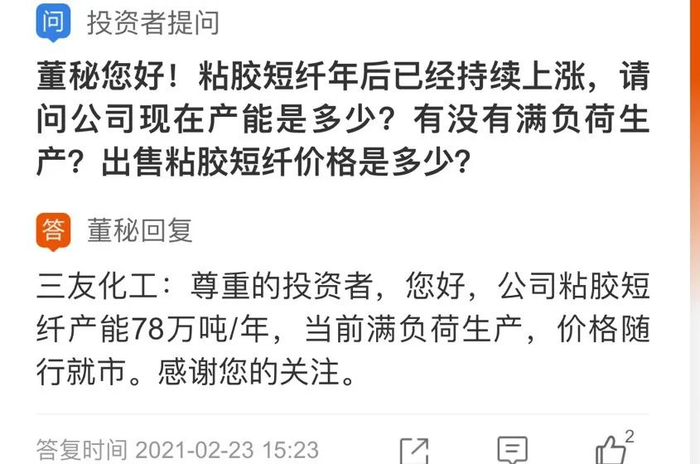 2月23日,公司在投资者互动平台也表示,粘胶短纤产能为78万吨/年,当前满负荷生产,价格随行就市。