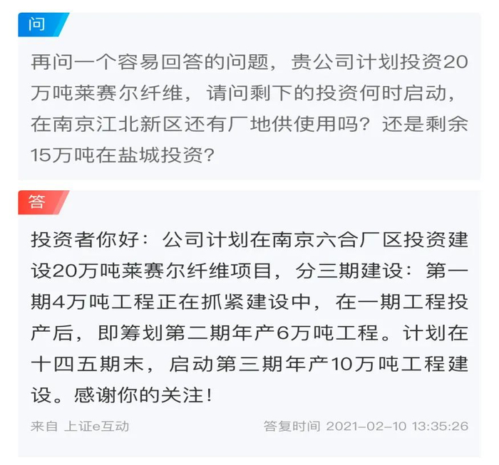 日前,公司在投资者互动平台表示,公司计划在南京六合厂区投资建设20万吨莱赛尔纤维项目,分三期建设:第一期4万吨工程正在抓紧建设中,在一期工程投产后,即筹划第二期年产6万吨工程。计划在十四五期末启动第三期年产10万吨工程建设。