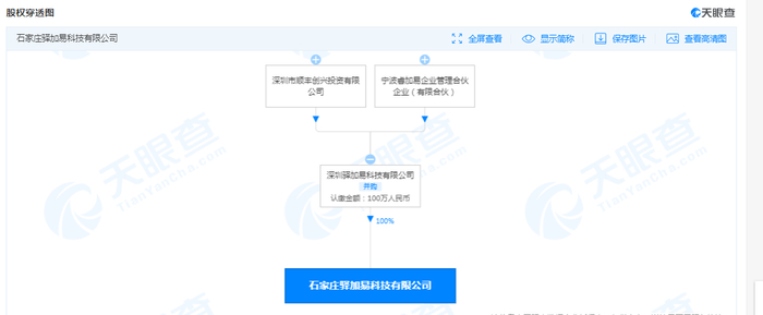 天眼查股权穿透图显示,石家庄驿加易科技有限公司由“驿收发”的运营主体深圳驿加易科技有限公司全资持股,后者由深圳市顺丰创兴投资有限公司、宁波睿加易企业管理合伙企业(有限合伙)共同持股。