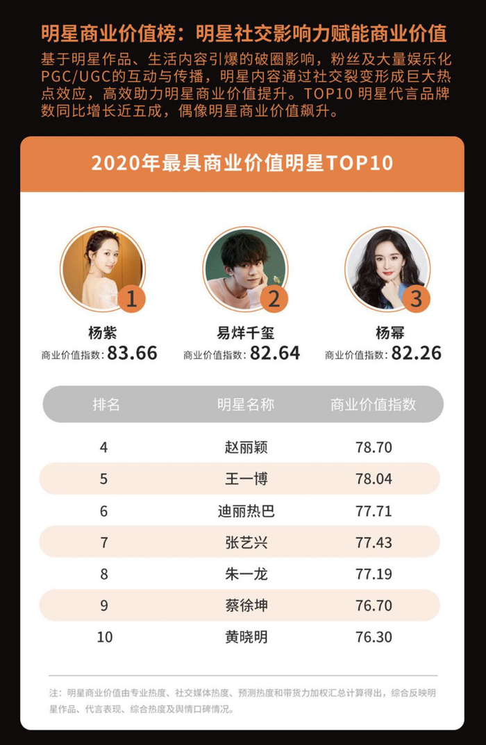 2020年最具商业价值明星中,杨紫居榜首,易烊千玺、杨幂位列第二、第三。