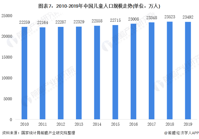 童袜适用于年龄在15周岁以下(不包含15周岁)的儿童,根据国家统计局的数据显示,2010-2019年中国儿童人口规模呈现逐年上升趋势,虽然国家开放了二胎政策,但是多数年轻人选择只要一个孩子甚至暂时不要孩子从而导致儿童人口规模增速近年来呈现降低趋势。在2019年,中国儿童人口规模达到了23492万人,较2018年下跌了0.13%。