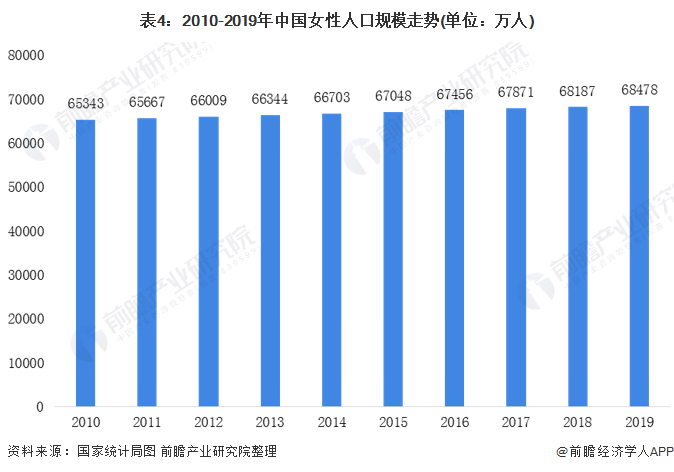 根据国家统计局的数据显示,我国女性人口规模呈现上升趋势。在2010年,中国女性人口规模达到了65343万人,随后上升至2019年的68478万人。