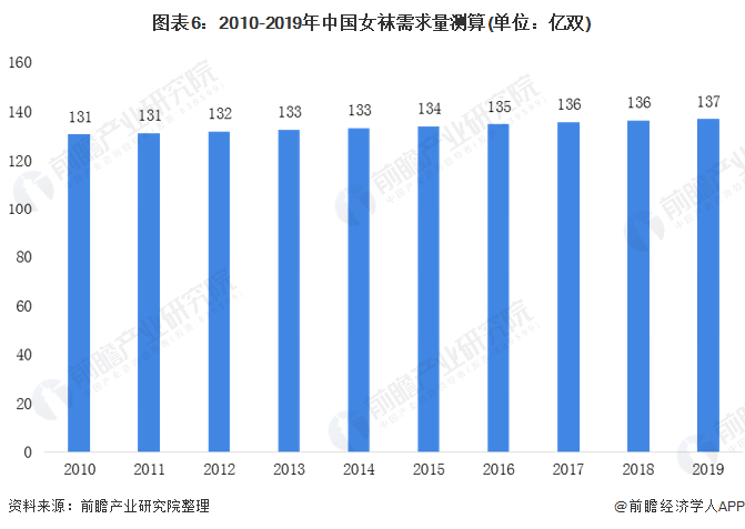 根据女袜使用人数以及人均需求量,前瞻测算得到2010-2019年我国女袜的需求量。2010-2019年,中国女袜的需求量呈现上升趋势。在2010年,中国女袜需求量约为131亿双,随后以年复合增速0.5%上升至2019年的137亿双。