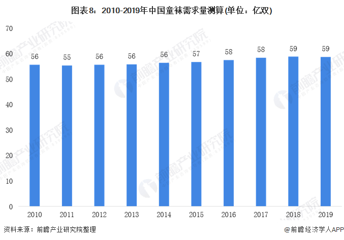 根据童袜使用人数以及人均需求量,前瞻测算得到2010-2019年我国童袜的需求量。2010-2019年,中国童袜的需求量呈现上升趋势。在2010年,中国童袜需求量约为56亿双,随后上升至2019年的59亿双。