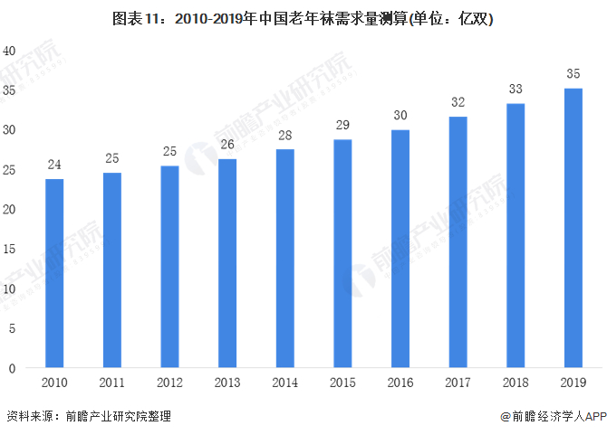 根据老年袜使用人数以及人均需求量,前瞻测算得到2010-2019年我国老年袜的需求量。2010-2019年,中国老年袜的需求量呈现上升趋势。在2010年,中国老年袜需求量约为24亿双,随后上升至2019年的35亿双。