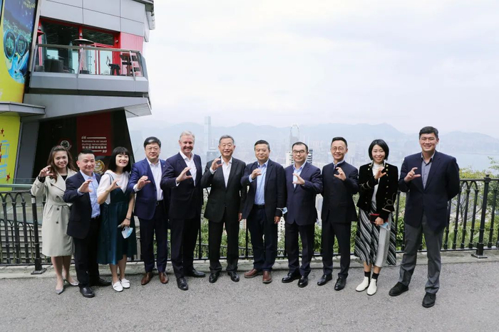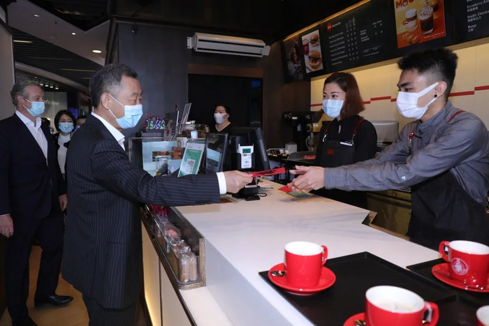 下午,王董一行来到素有"网红打卡点"之称的太平洋咖啡山顶凌霄阁分店,关心疫情对咖啡生意的影响。得知香港对公业务(2B)运营良好,王董表示这种生意模式值得在内地市场推广,可以研究为更多大企业甚至航空公司提供定制化的咖啡服务。