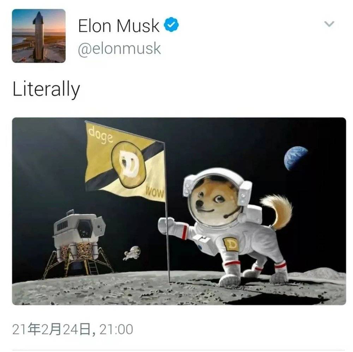 一周之后的2月24日,马斯克在推特上更新了一张狗狗币登陆月球的图片,并配文:“照图理解”。