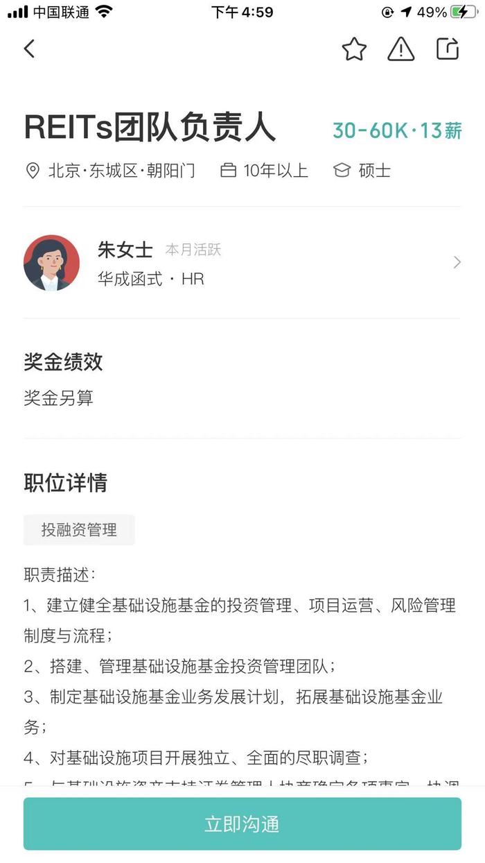 北京华成函式技术有限公司为REITs团队负责人开出了3万~6万月薪,负责搭建、管理基础设施基金投资管理团队等统领性业务,要求具备10年以上基础设施项目投资管理经验、5年以上团队管理经验。