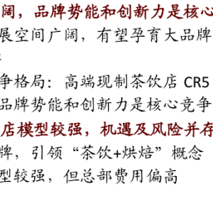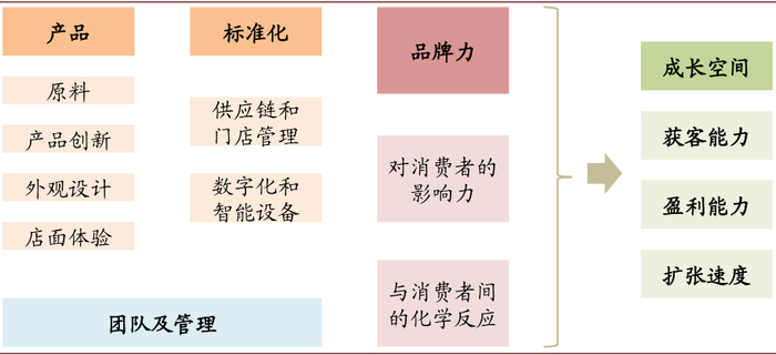 品牌力是深厚护城河。一个品牌的发展空间有多大取决于品牌势能,即对消费者的影响力和与消费者之间的化学反应。当一个品牌对消费者形成了强大的影响力、能够引领消费者的认知、与消费者产生了情感纽带,才能形成很高的品牌忠诚度和粘性,最终把“品类消费者”转化为“品牌消费者”,进而获得广阔成长空间(更强的获客能力、更高的盈利水平和更快的扩张速度)。而要想增进品牌势能,需要追求灵感、追求极致,提供持续达到甚至超过预期的产品和体验。具体而言,就是立足于原料、产品创新、外观设计、店面体验等,并通过标准化运营管理实现一贯始终的高质量。