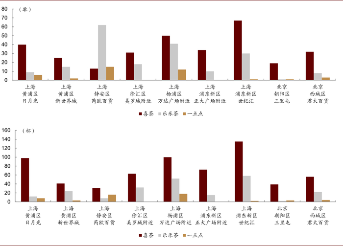 排队情况是品牌力的体现,喜茶作为新茶饮的开创者和引领者、品牌力位列第一。根据《2020中国新茶饮行业发展白皮书》,在新茶饮品牌中,位列品牌知名度前四的是喜茶、奈雪的茶、乐乐茶、茶颜悦色(在消费者首先想到的新茶饮品牌中,四个品牌的占比分别为42%、32%、4%、4%),位列品牌受欢迎度前四的是喜茶、奈雪的茶、茶颜悦色、乐乐茶(在消费者最喜欢的新茶饮品牌中,四个品牌的占比分别为32%、24%、13%、11%)。我们对比了现制茶饮品牌在同一时间的排队情况,在上海和北京的9个典型商圈,喜茶、乐乐茶、一点点的平均等待单量分别为35、22、4,平均等待杯量分别为71、25、6。