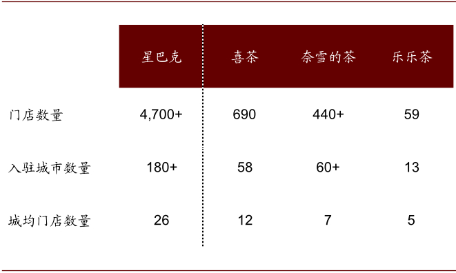 对标星巴克,领先现制茶饮品牌仍有较大渗透空间。星巴克在定位客群、选址等方面与高端现制茶饮品牌有一定相似性,截至2020年末,星巴克已经在中国入驻180多个城市、拥有超过4,700家门店。对比之下,领先的现制茶饮品牌如喜茶、奈雪的茶、乐乐茶在门店数量、入驻城市数量、城均门店数量上均有较大提高空间。