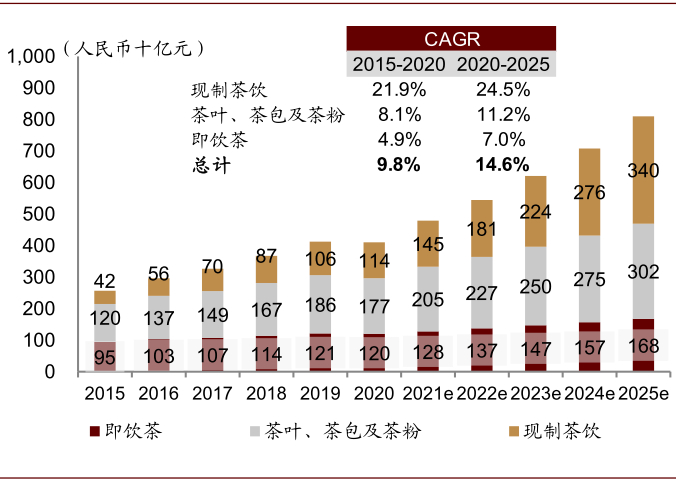 中国茶文化源远流长,茶占非酒精饮料市场超35%。茶一直是中国最受欢迎的饮品之一,根据灼识咨询数据,按零售消费价值计,2020年中国茶市场规模约4,107亿元,占非酒精饮料市场超过35%,远超过中国咖啡市场约655亿元的规模;其预计中国茶市场规模将以14.6%的CAGR增长至2025年的约8,102亿元,超过非酒精饮料行业10.4%的增速。
