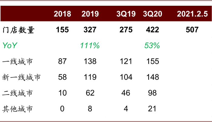 奈雪的茶是中国高端现制茶饮连锁品牌,专注于提供采用优质食材现制的优质茶饮。自2015年在深圳开设第一家奈雪的茶茶饮店以来,奈雪的茶门店数量已由截至2017年底的44家增加至3Q20末的422家(中国大陆61个城市的420家+中国香港1家+日本1家),并进一步增加至2021年2月5日的507家。