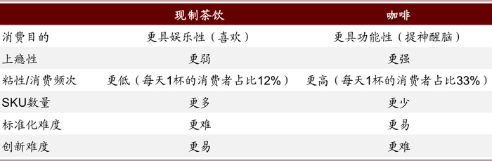 星巴克的成功验证了咖啡是一门能够出大品牌的生意,相比咖啡,现制茶饮更具娱乐性(基于喜欢去消费)而非功能性(提神醒脑)、上瘾性不如咖啡强,因此粘性不如咖啡强、消费频次不如咖啡,根据CBNData和奈雪的茶联合发布的《2020新式茶饮白皮书》,每天1杯或更多的新茶饮消费者占比12%,而根据《2018-2019中国咖啡消费蓝皮书》,每天1杯或更多的咖啡消费者占比33%。此外,现制茶饮较咖啡SKU更多,因而标准化难度更高,也引发了现制茶饮时尚风险更高的担忧。不过我们认为现制茶饮也有优于咖啡之处: