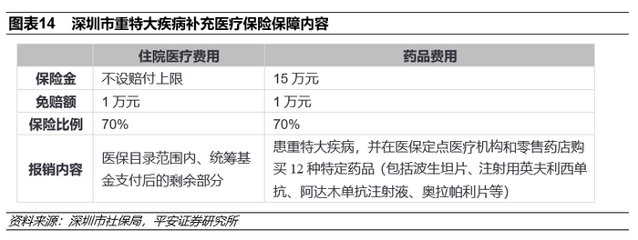 无需申请理赔,实时结算提高使用率。与大多数“惠民保”不同,“深圳市重特大疾病补充医疗保险”政府参与度极高,与基本医疗保险打通,参保人在定点医疗机构住院就诊后,费用可在医院即时结算,无需再向保险公司另行申请理赔,有效提升医保账户使用和报销效率。产品具体保障内容包括住院医疗费用及药品费用两部分,在基本医保范围内报销,但免赔额较高,且存在赔付比例,仅能赔付医保范围内统筹基金支付后扣除免赔额剩余部分的70%,因此保障程度有限。