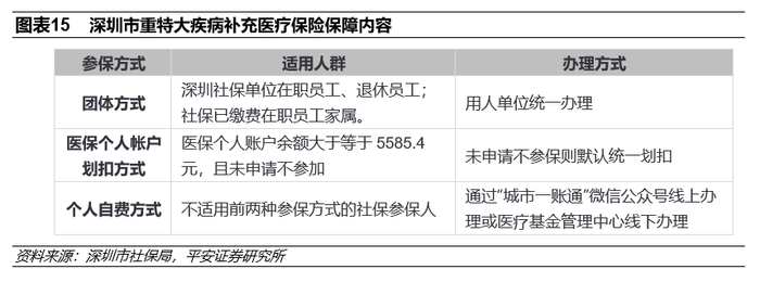 ②客户再开发:以深圳市重特大疾病补充医疗保险为例,尽管初始参保人数即约500万且持续增长、参保率超过50%。但根据湖南大学研究所,该产品在2015年推出之初,赔付率一度超过130%,其长期存续、持续发展,主要系承保公司“平安养老”注重客户资源的获取和开发,在此基础上拓展百万医疗和重疾险等业务,为商业健康险带来约3000万元的增量业务和数百万的增量个人客户。