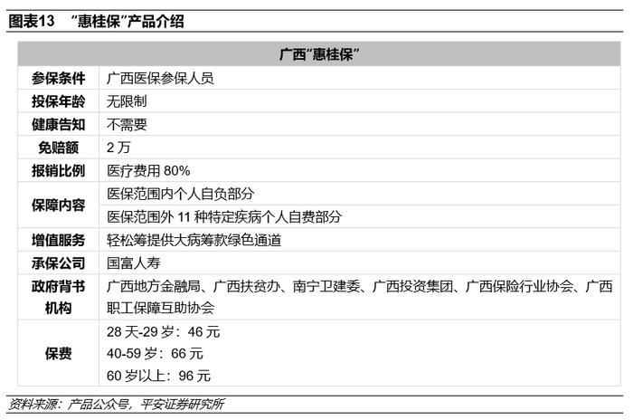 存在更高保障需求的人群仍需商保参与提供全面保障。从保障范围来看,“惠民保”大部分产品仍为社保内医药费用报销,报销比例普遍在70%-80%报销比例,存在保障缺口。从增值服务来看,“惠民保”并不提供住院津贴,无法提供“百万医疗”等短期健康险产品对于医疗费用外的误工损失、食宿费用、外地就医旅费等的收入补偿。从投保门槛来看,“惠民保”健康告知要求较宽松、并无年龄限制保费较低,因此,将主要为部分年龄偏大或收入偏低、无力购买商业保险的人群提供医保外的部分基本保障。面对“惠民保”免赔额较高的情况,广西“惠桂保”引入众筹消除免赔门槛,增强产品普惠效果。但由于产品门槛低、定价低,预计将以医疗费用支出报销为主要保障内容,而非收入补偿。