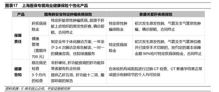 针对带病人群,提供个性化产品。除为健康人群提供的行业统一产品之外,中国人寿、泰康养老分别为上海医保投保人中带病人群设计了个性化产品。肺结节人群可选择“国寿肺安宝特定肿瘤疾病保险”;“泰康关爱肝疾病保险”则支持乙肝病毒携带者和感染者、慢性乙型肝炎患者(大、小三阳)、轻度肝纤维化患者、酒精肝、药物肝、脂肪肝、肝病家族遗传史及肝脏受损等人群投保。