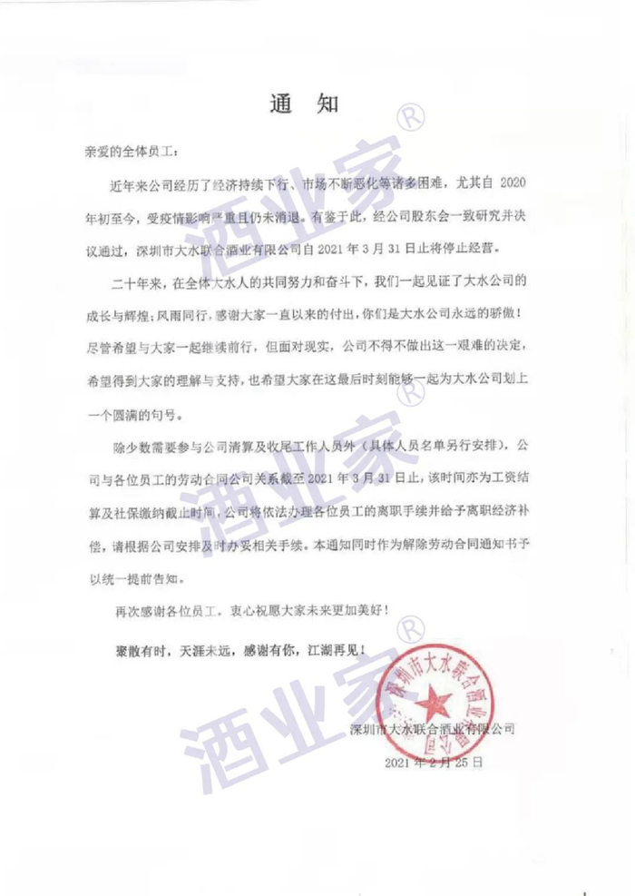2月25日,酒业家独家获悉,深圳市大水联合酒业将于3月31日正式停止经营。
