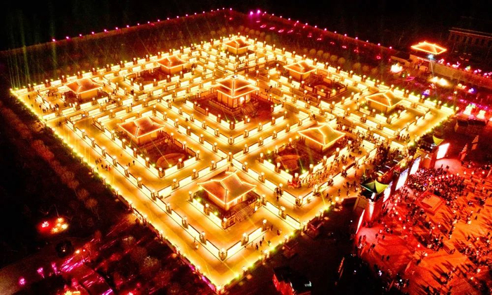 甘肃省张掖市九曲黄河灯阵灯火辉煌。365盏明灯围绕着9座大殿,构成古代占卜“九宫八卦”形制,宛如一座金光灿烂的迷宫。