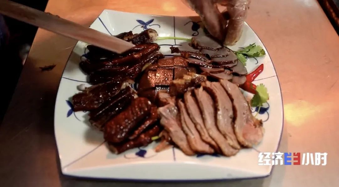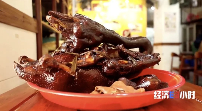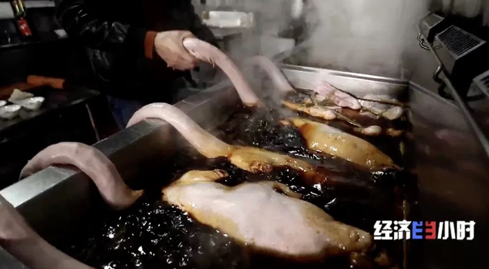 潮汕卤鹅,要求必须是当天清晨宰杀的鹅,而且鹅身除了颈部之外不能有伤痕,所以从宰杀到清理,整个过程只能人工操作。清洗不光关乎卖相,还影响味道,李恒勤需要把鹅的口腔、脖子、脚掌等部位反复清洗,处理干净之后将整只鹅用干草捆好,放入事先调好的卤汤之中卤制四个小时。一只鹅大概要卖1800元。