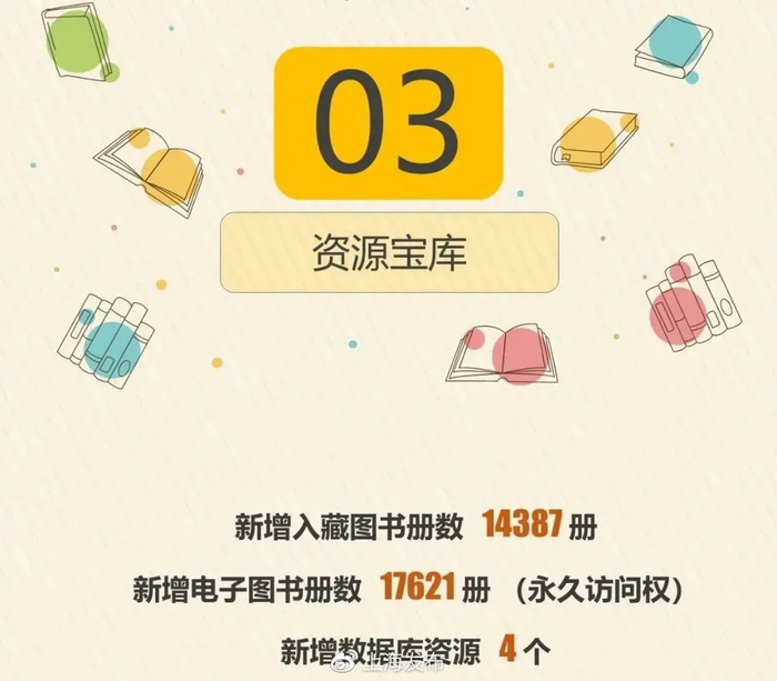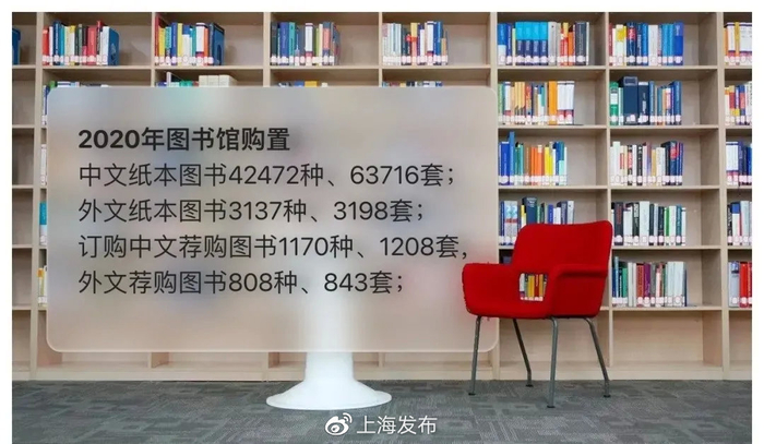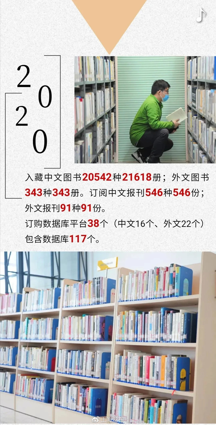 2020年上海应用技术大学图书馆新增纸质中外文图书32319册,馆藏文献总量达到303万册,其中纸质文献162万册,电子文献141万册/件,现有42个电子数据库,电子资源使用量为2057万次。