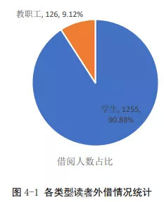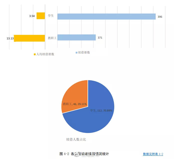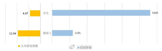 从借阅人数看,1255名学生发生过借阅行为,总借阅册数为 5609;从借阅人数看,126名教职工发生过借阅行为,总借阅册数为1195。学生、教职工的平均借阅册次分别为4.47、12.94。