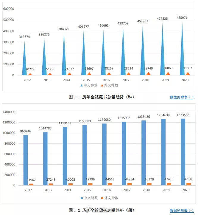 截至2020年10月31日,图书馆馆藏图书517023种,1321202册,其中中文图书485971种,1273586册;外文图书31052种,47616 册;图书馆藏以中文为主,中文册数占比近 96.39%。