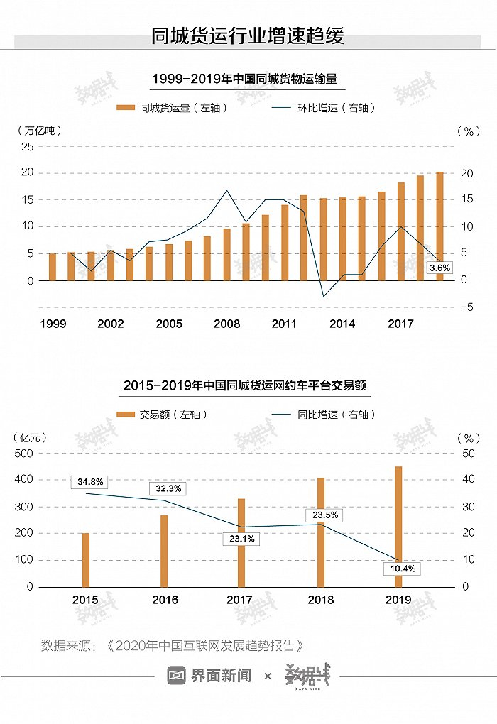 据《2020年中国互联网发展趋势报告》,2019年中国同城货运量增速为3.6%,连续2年下降,总体市场增长趋缓。货运网约车平台的发展也在减慢。2019年中国同城货运网约车平台交易额增速为10.4%,为近5年来最低。