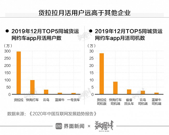 大规模扩张下,用货拉拉的人也越来越多。据《2020年中国互联网发展趋势报告》,2019年12月,货拉拉app在同城货运网约车app中月活用户数和月活司机数均为第一,比排名第二的企业多出两倍。