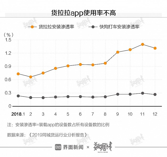很多人用货拉拉app都是“用完即卸载”。据界面数据目前找到的最新数据、《2019同城货运行业分析报告》显示,2018年,货拉拉app的用户安装渗透率不足2%。