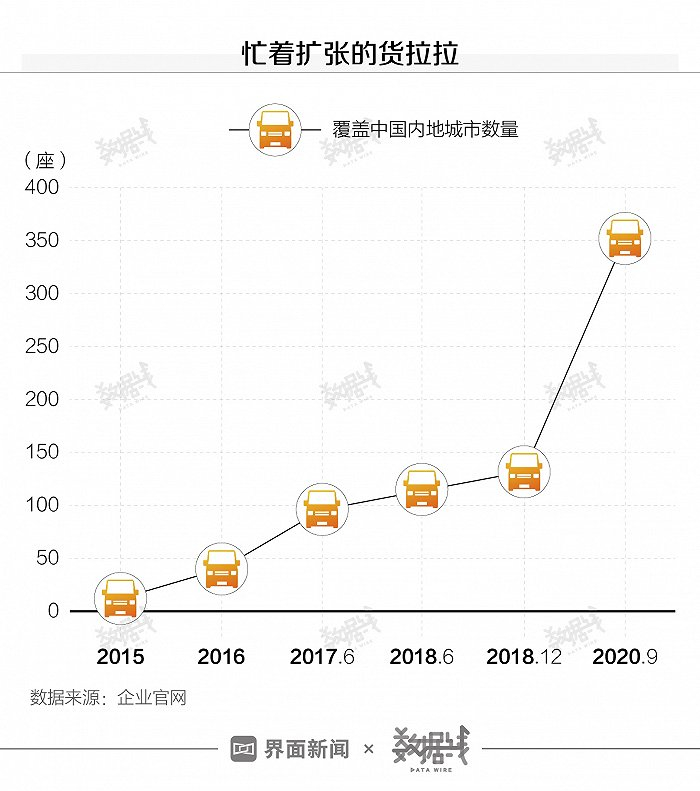 为了吸引更多的企业订单,货拉拉把精力花在了扩张上。2018年,货拉拉中国大陆开通城市达132座,到2020年9月,开通城市已达352座,不到两年的时间里,货拉拉新进城市超过200座,涨幅达167%。