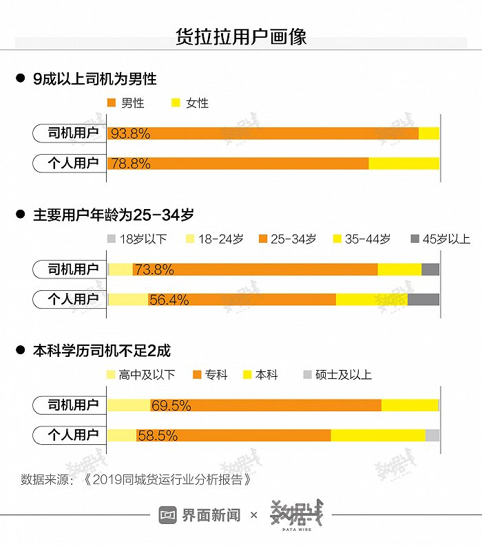 据《2019同城货运行业分析报告》,货拉拉平台司机9成以上都是男性。有8成司机年龄不到35岁。从学历来看,超8成的司机学历在本科以下。用户方面,货拉拉平台用户中女性约占2成。24岁以下的用户占比达12.3%。本科及以上学历用户有3成多。