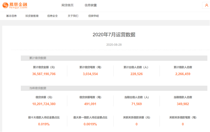 官网最新运营数据显示,截至2020年8月28日,凤凰金融累计借贷金额365.87亿元,累计借贷笔数303.46万笔,累计出借总人数为22.85万人。与此同时,凤凰金融的当期借贷余额高达102亿元,当期出借人数达到7.16万人。