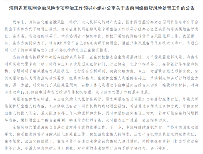 凤凰金融的情况引起了当地金融机构的关注。2020年11月10日,海南省互联网金融风险专项整治工作领导小组办公室发布关于当前网络借贷风险处置工作的公告,并“点名”凤凰金融。