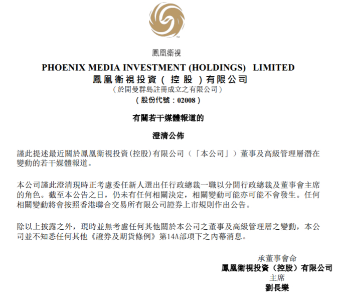 其中,凤凰卫视还指出,公司正考虑委任新人,选出行政总裁一职以分开行政总裁及董事会主席的角色。截至本公告之日,仍未有任何相关决定,相关变动可能亦不会发生。除此之外,公司并无考虑任何其他关于公司董事及高级管理层的变动。