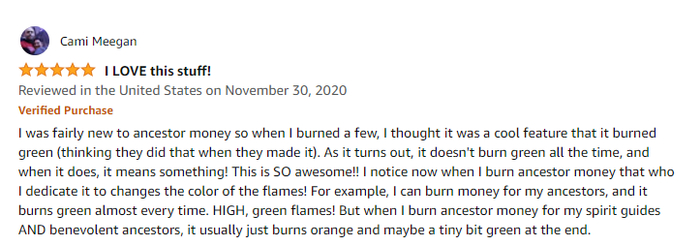 不像果篮,这款产品好在描述写的很清楚,不会有人真的拿来骗小孩玩……别以为只有华人会买,下面这位看起来并非华人的女士就买上瘾了而且还研究出了一点烧纸钱的心得: