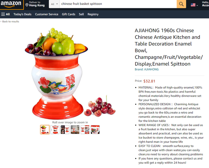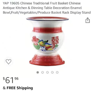 这款“60年代中国传统果篮中国古典厨房饭桌装饰搪瓷碗/水果/蔬菜/作物篮”,在美亚上的未含税售价高达62美元。