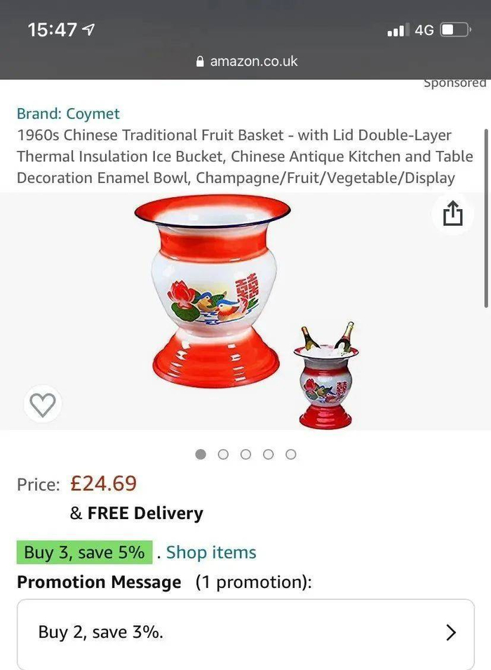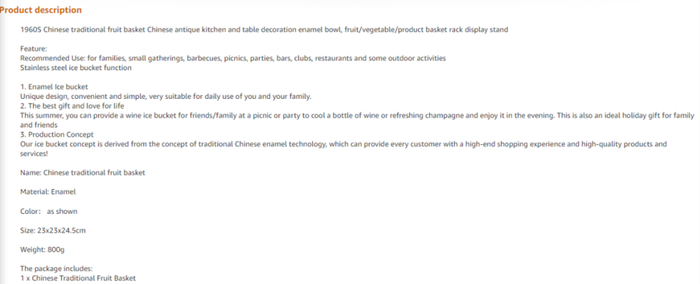类似的产品,在上周的亚马逊上层出不穷,价格从20多到6、70美元不等。许多listing都带有“果篮”、“冰桶”、“中国风古典装饰”类似的描述,还配上了它装着水果、饮料、冰酒、面包的配图……