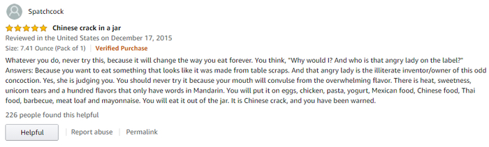 答案:因为你想要吃点看起来像是厨房边角料做的东西,而那位生气的大妈正是这款诡异调和物的发明者(她还是个文盲)。是的,她鄙视你。你不应该吃这东西,因为它满溢的味道——辣、甜、独角兽的眼泪以及另外一百种只有汉语才能形容的味道——会让你的嘴开始抽搐。你会把它加到鸡蛋、鸡肉、意面、酸奶、墨西哥菜、中国菜、泰菜、烧烤、肉饼和蛋黄酱上面。你将会无法控制自己直接对着瓶子吃。它就是来自中国远渡重洋的毒品,别说我没警告过你。