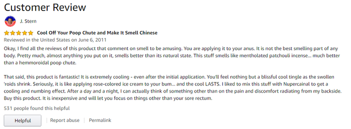 说真的,我觉得你们有些人说这产品有味道什么真是搞笑。你是把它擦到哪儿的?在那儿擦什么能比原来的味道更难闻呢?……我觉得这东西的感觉很好,就像在屁屁上抹了玫瑰色的冰激淋一样……