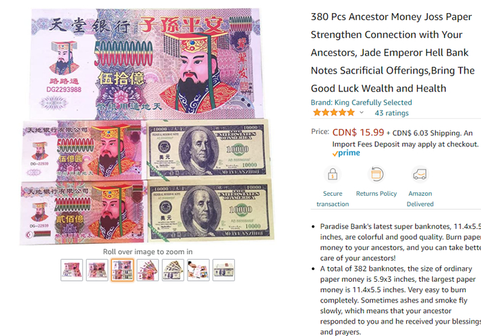 在比如下面这款纸钱,让我们来看一下它的商品名:“380张纸钱,和你的祖先加强连接,玉皇大帝冥通银行钞票祭祖上贡,带来好运和健康”。