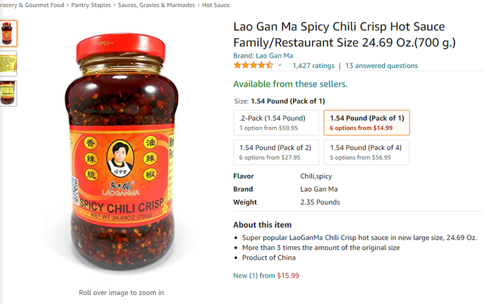 感谢一些美食博主和频道的推介,老干妈现在在海外卖的很好。在亚马逊上,可以找到很多老干妈的 listing,大部分评分都很高,接近5星。