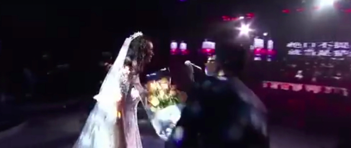 一个月后,柳岩在自己的音乐会上身穿婚纱唱了这首歌。唱到一半时,大鹏举着鲜花上了台,柳岩哭花了妆,不敢侧过头看他。