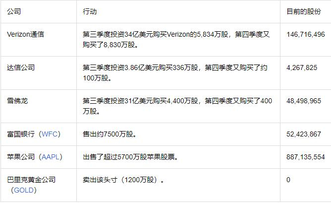 伯克希尔此前未披露从其现金储备中抽走了数十亿美元对上述公司投资。但同时,该公司在第四季度也抛售了部分持股,因此现金在投资组合中仍占相当大的比重。下表总结了去年第四季度执行的一些值得关注的交易(包括第三季度对雪佛龙、威瑞森和达信的投资)。