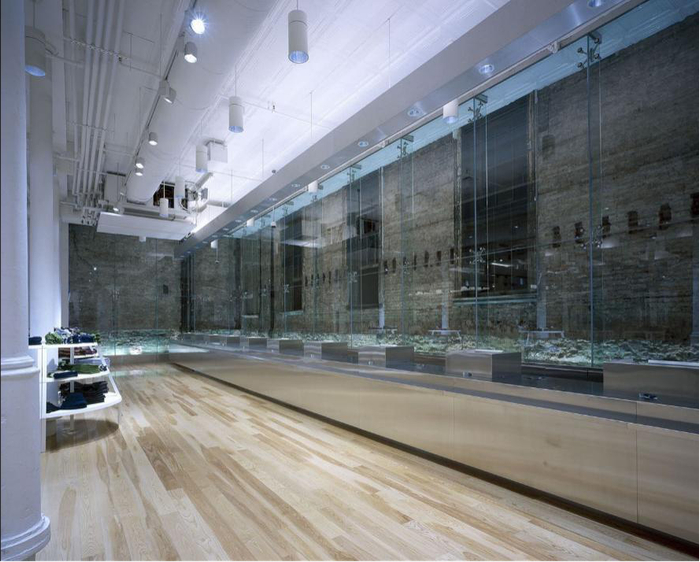 比如优衣库纽约旗舰店地处一栋古老的大楼,我就把这一面历史悠久的墙壁完整保留下来,在前面设置博物馆的玻璃,加上照明,看起来就很像一幅艺术品。顾客在收银台排队时,可以像欣赏艺术一样欣赏纽约历史。