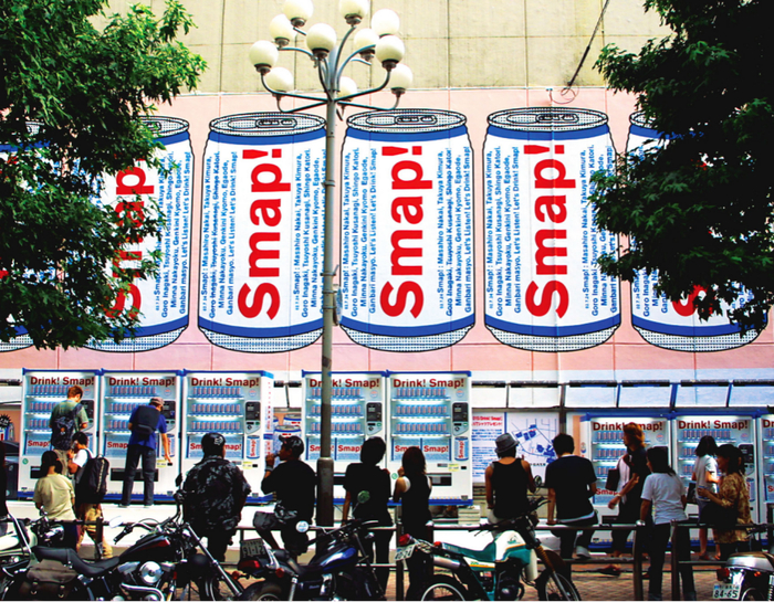 我还和麒麟饮料合作开发了周边饮料“Drink!Smap!”在涩谷安装像艺术品一样的自动售卖机,只使用SMAP专辑的三种颜色。每次SMAP发专辑,整个涩谷的景观都会为之一变。