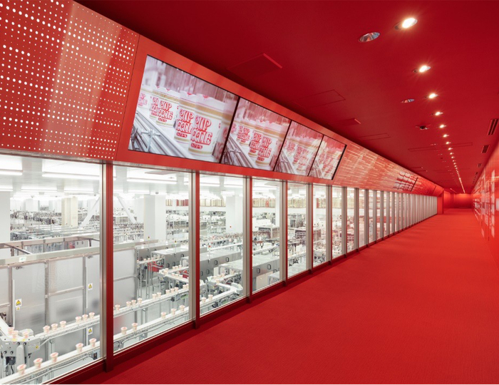 进入工厂之后,是一条长达200米的大红色隧道,隧道以外的工厂部分只有白色、银色和红色。隧道顶部装有四台显示器,不仅可以看到方便面生产的特写画面,还会在工厂采样油炸的声音、切面的声音并制作电子音乐,好像进入游戏中心或俱乐部,是非常有趣的工厂空间。