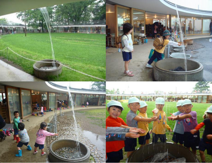 一般的水池都置于墙边或洗手间附近,而藤幼儿园特意将水池置于教室中间,增加孩子们对话和交流的机会;再比如广场外的水龙头下面没有水槽,水会直接溅到地上,小孩子就可以玩水,而且故意使用老式的水龙头,孩子需要使劲拧才能关上;同样不便利的设计还有很多,如故意有一些起伏和坑洼的草坪、漏风的推拉门、需要用绳子控制开关的灯等,让各种设备变成一个个玩具。